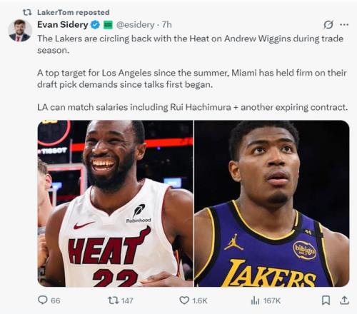 根据NBA记者埃文-斯迪瑞写道:湖人队已经重启了跟热火队的谈判,湖人依旧想要得到安德鲁-威金斯。自今夏开始,湖人一直都在努力的交易得到维金斯,但迈阿密一直要求得到未来选秀权与年轻资产,湖人希望用八村垒+添头去换威金斯,这使得交易陷入僵局。